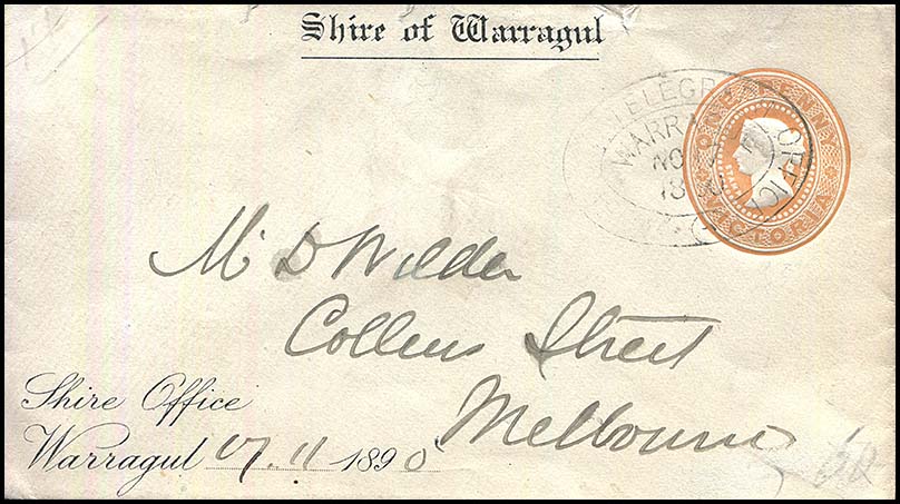 On a Shire of Warragul embossed official envelope with a Belt & Buckle date stamp of 17 November 1890