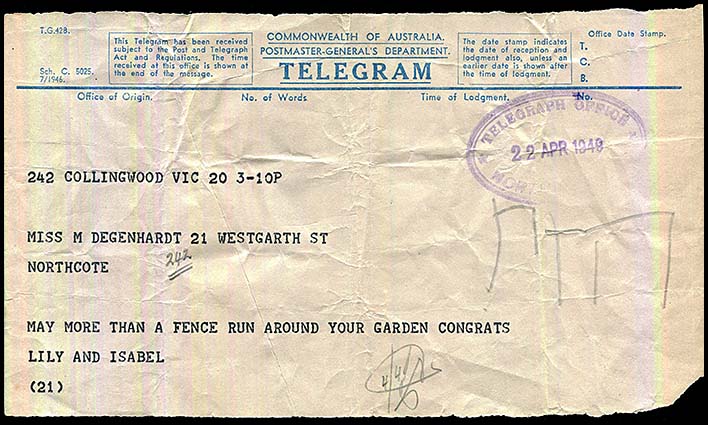 The usual postal date stamp was also used on telegrams.