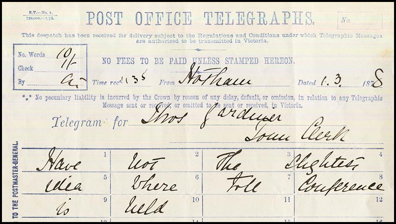 | Early use. The earliest evidence of the operation of the Hotham Telegraph Office is a telegram delivery form (VC-DO-8B) used for a message transmitted from Hotham to Richmond on 1 March 1878. | ||