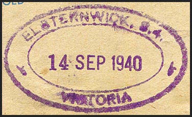 | A rubber oval date stamp (RO3-ELSTERNWICK) marked ELSTERNWICK but no inclusion of either TELEGRAPH or POST OFFICE.
