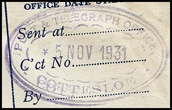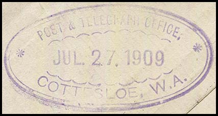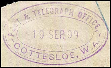 A Receiving Office was opened at Cottesloe in October 1894. It was upgraded to a Post & Telegraph Office on 22 November 1897. At least five types of date stamps appear to have been issued to Cottesloe for telegram use: |