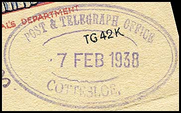 ![]() 7 February 1938 - in violet. Used on Social Telegram AB-GSF-36. |