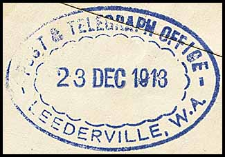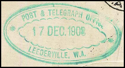 ![]() 17 December 1908 . Used on a well marked cover from Perth to Leederville to the Dead Letter Office. |