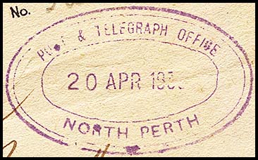 In the Legislative Assembly on Tuesday 31 July 1894, the Colonial Treasurer stated that Post and Telegraph Offices would be shortly established at North Perth and East Perth. In the Legislative Assembly on 24 September 1895, in answer about facilities at North Perth from Mr. Wood, "The PREMIER (Hon. Sir J. Forest) replied that the Postal Department had been endeavoring to give accommodation to North Perth but, up to the present time, had been unable to secure a building suitable for a Post and Telegraph office. It was intended to build an office, but, in the meantime, a pillar box would be erected on a convenient site". North Perth was established as an Allowance Office on 1 December 1902. In 1903, it became a Receiving Office located on Angove Street. It became an Official Office in October 1912. The date stamp shows clearly the Office was a Post & Telegraph Office before either of those designations. Even so, it appears that planning for a Post Office really started in May 1905 when an architect - Michael Cavanagh - agreed to sell a block of land opposite the new North Perth Town Hall to the Post Master General’s Department. Despite that initiative, the Post-Master General was quoted in The West Australian in July 1909 maintaining that the creation of a Post Office for North Perth was not yet required: