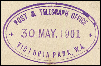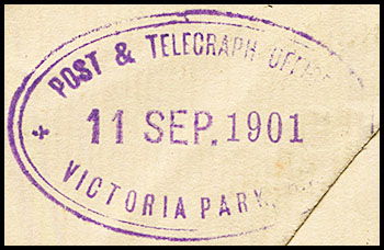 | Six date stamps are recorded for use with telegraphs at Victoria Park. Five of these were rubber and one appears to be steel. One of the rubber date stamp was inscribed POST OFFICE. | |