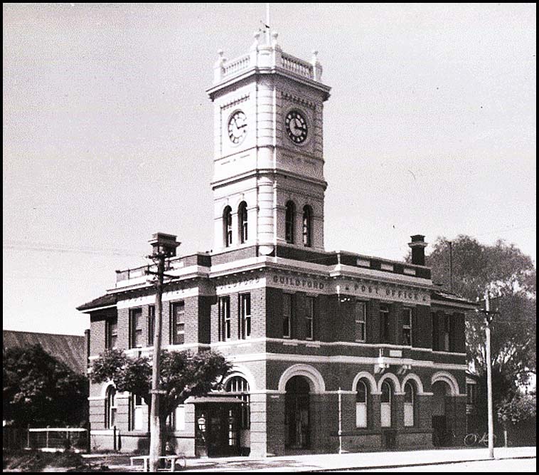 The Perth-Guildford line was opened on 23 December 1871. It was not, however, until 6 August 1873, that the Perth Inquirer could report that "the new Post and Telegraph offices were opened on Saturday the 2nd instant. The building being close to the Court House, in the centre of the town, is much more convenient than formerly and provides very suitable offices and living-rooms for the Postmaster. In addition to these improvements, other arrangements now made will afford further benefits and facilities to the public". It was a starting point for the telegraph line along the coast to the south. A Post Office had been opened 22 February 1835. Guildford was one of three towns established in 1829 soon after Western Australia was settled. |