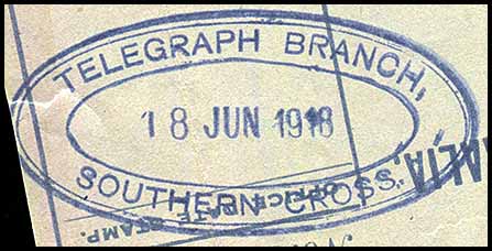 ![]() 3 February 1921 (but evidence the telegram may have arrived the previous day). Used on AE-DO-1Eb. The image has had the colour washed out to reveal the very faint date stamp. Form kindly supplied by Malcolm Brown, WA. |