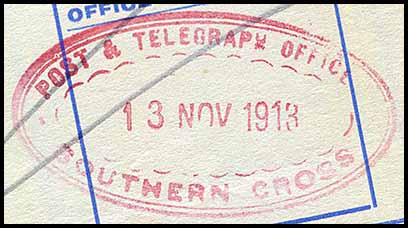 The Post Office at Dowerin opened on 1 September 1906. It became an Official Office (with Telegraph facilities) on 1 July 1912. A rubber oval POST & TELEGRAPH date stamp (RO4 - P&TO) was issued to the office for use with telegraphs. |
