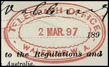 As no special date stamps for use with Telegraphs were issued to the office, the usual post office date stamp was used for telegraphic purposes. There were several formats used. An early format was framed with a 2 digit month and a 2 digit year:
