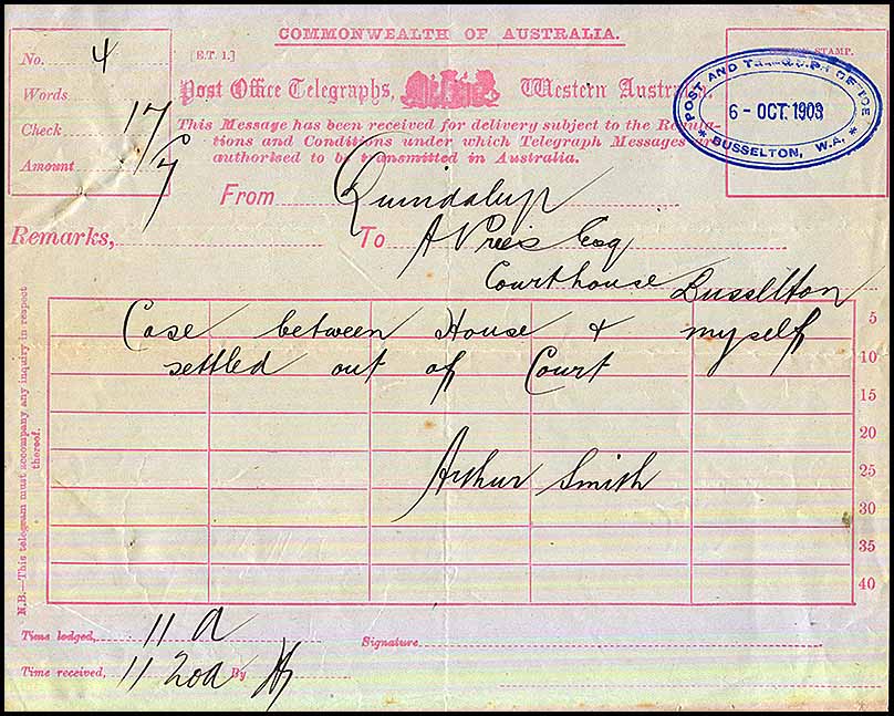 Telegram sent from Quindalup to Busselton on 6 October 1903.