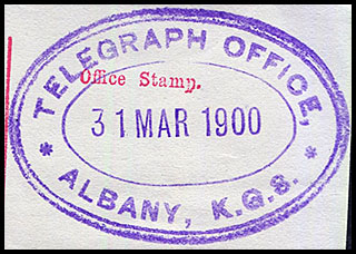 1. The first was a rubber oval date stamp (RO6- TO) inscribed TELEGRAPH OFFICE/ALBANY K.G.S.:
